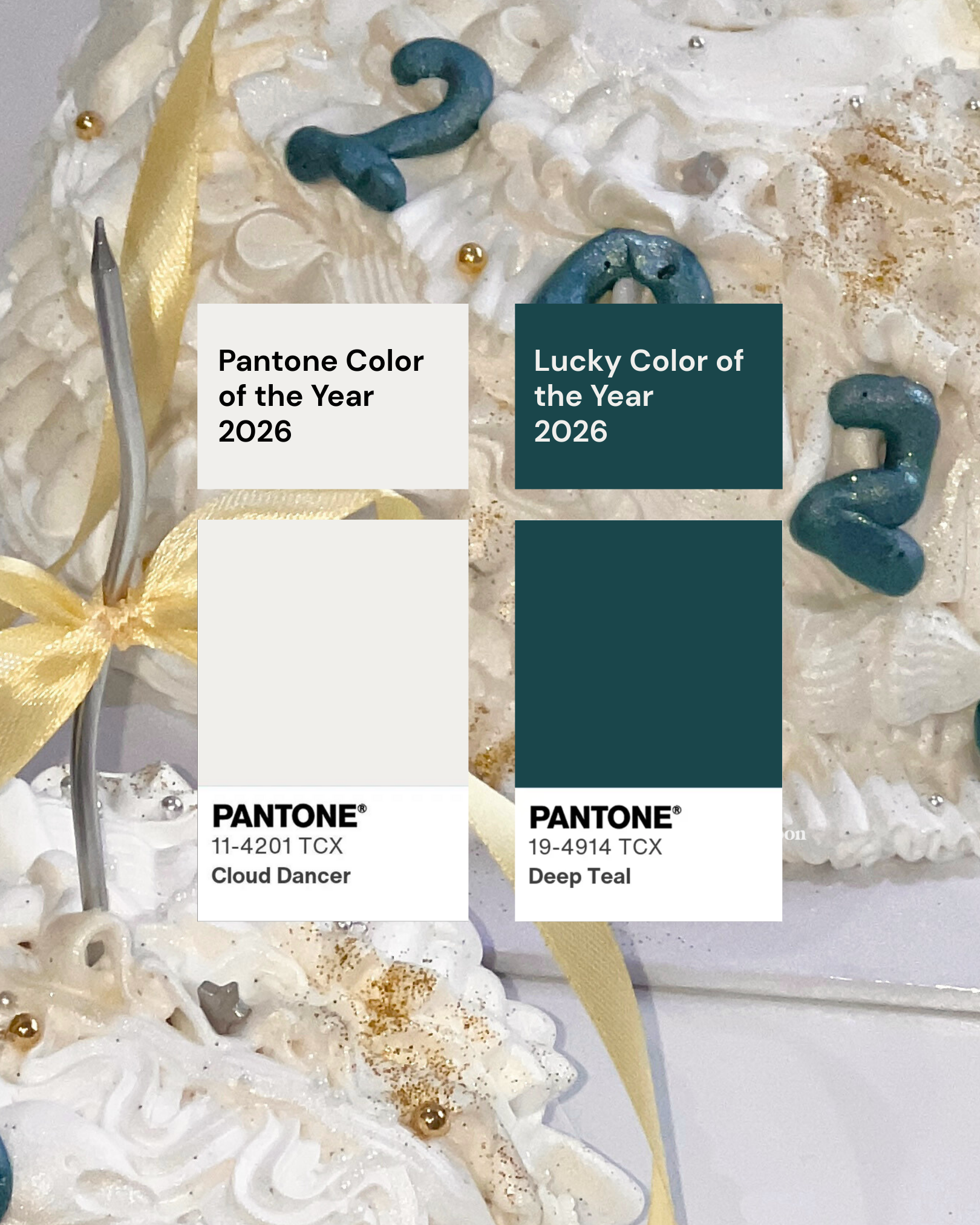 cakes come with pearl airbrush and glitters 🪩 all in theme for the 2026 colors of the year - cloud dancer and transformative teal!