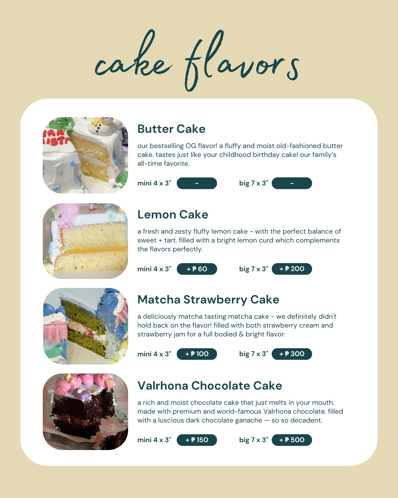 • big cake - 7x3 inches (can choose flavor)