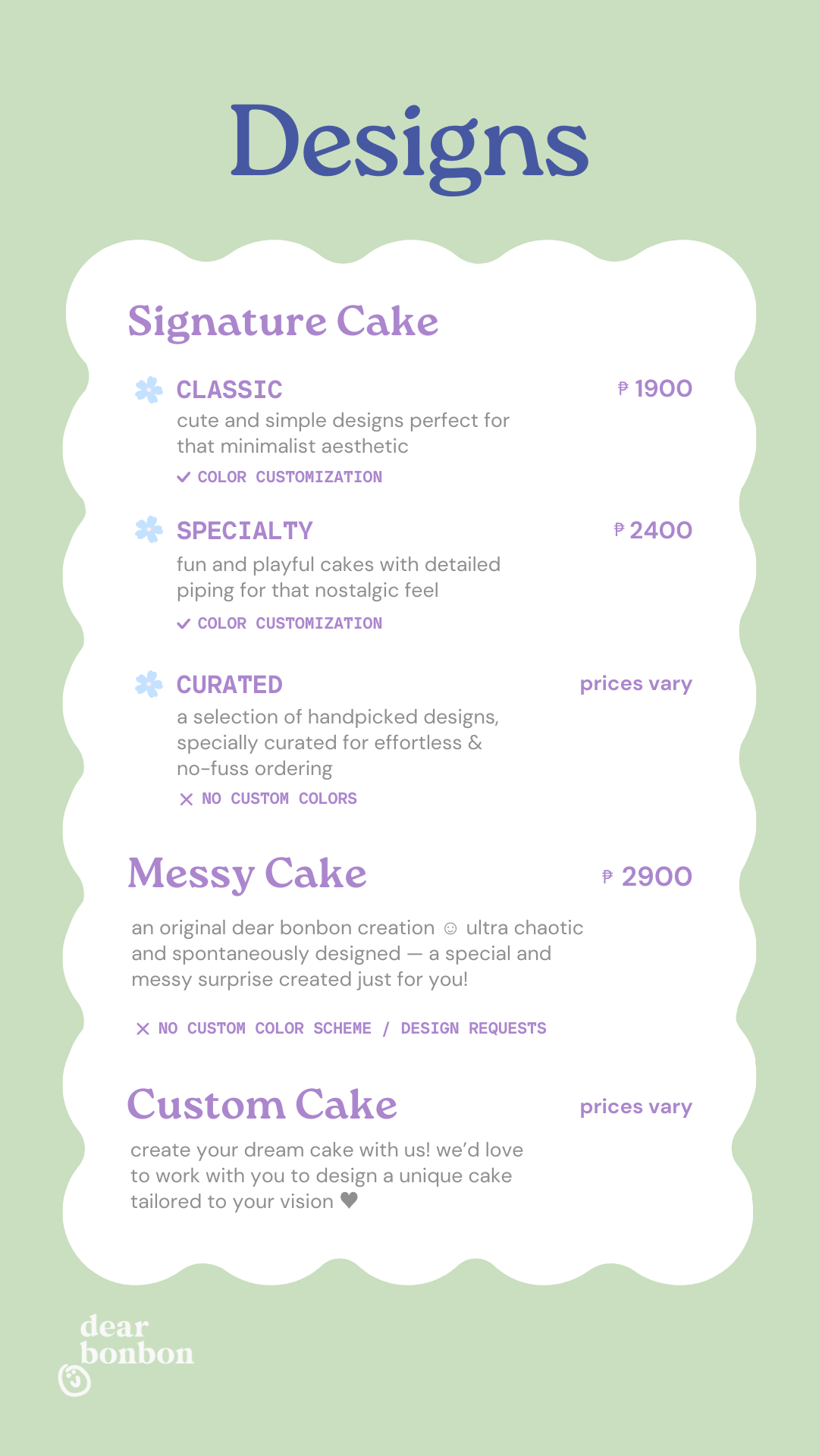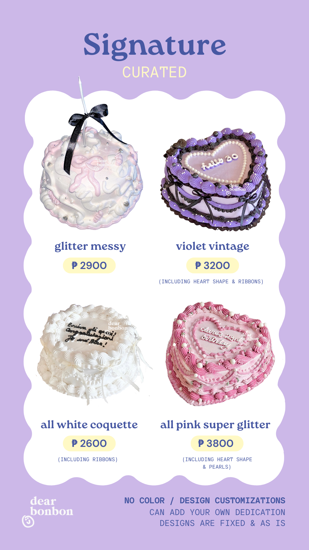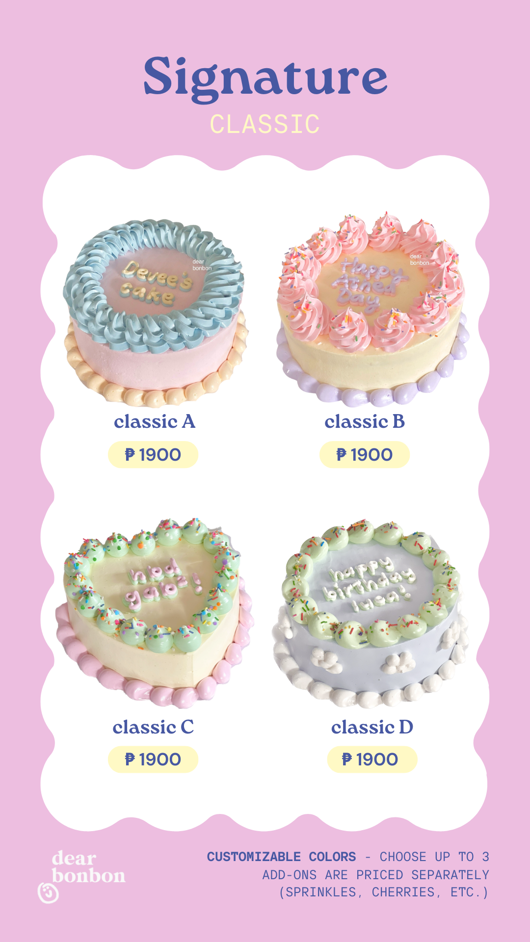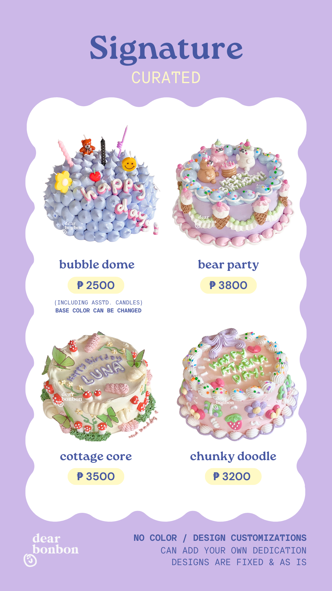 choose between our curated selection of cute pre-designed cakes ✿ double up the cuteness and add on some sprinkles, cherries, or candles to make it extra special!